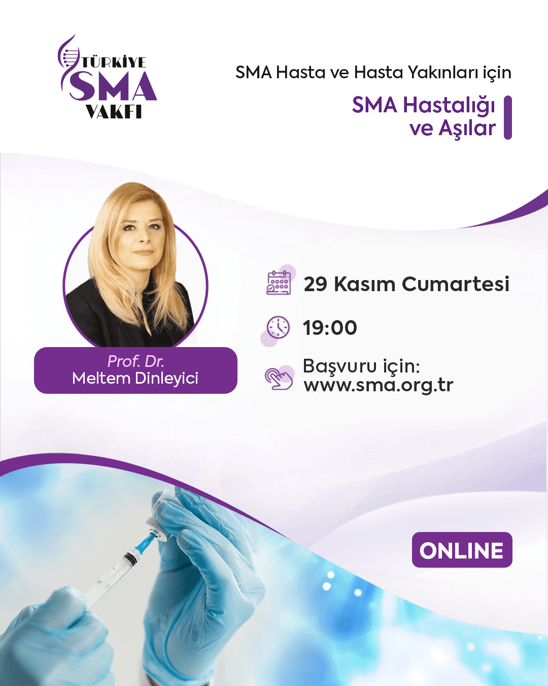 SMA hasta ve hasta yakınlarına yönelik olarak, Prof. Dr. Meltem Dinleyici tarafından “SMA Hastalığı ve Aşılar” konulu eğitim gerçekleştirilecektir.