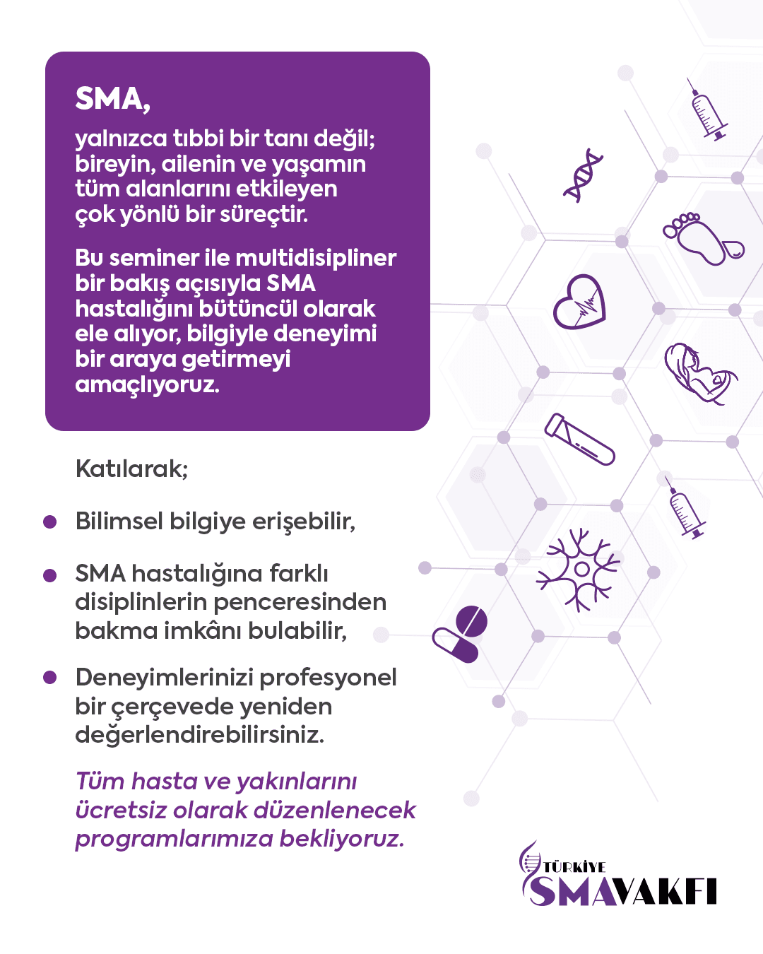 SMA hastalığıyla ilgili en güncel bilgiye, deneyimlere ve desteğe ulaşabilmeniz umuduyla başlattığımız programda paylaştıkça öğreniyor, birlikte güçleniyoruz.
