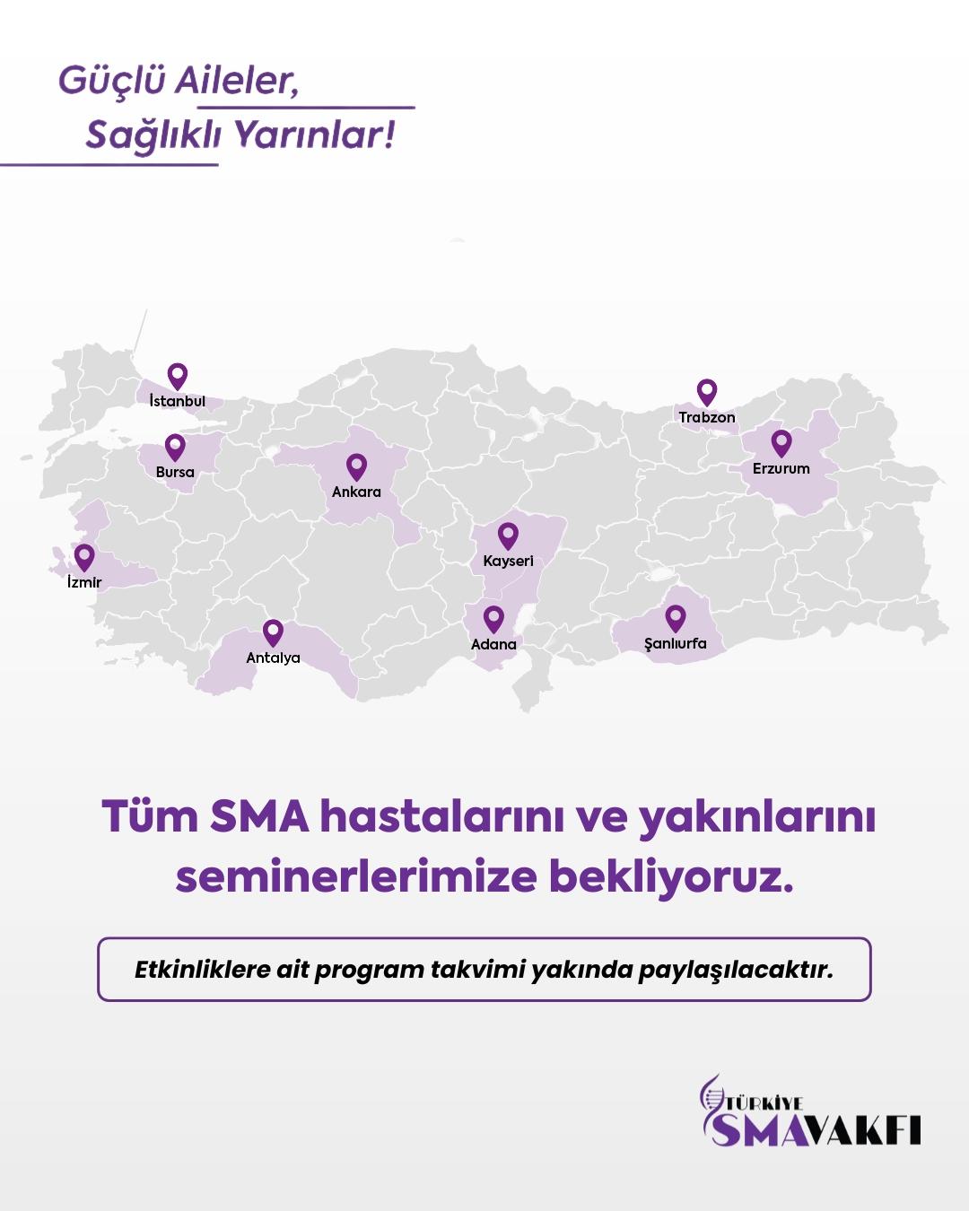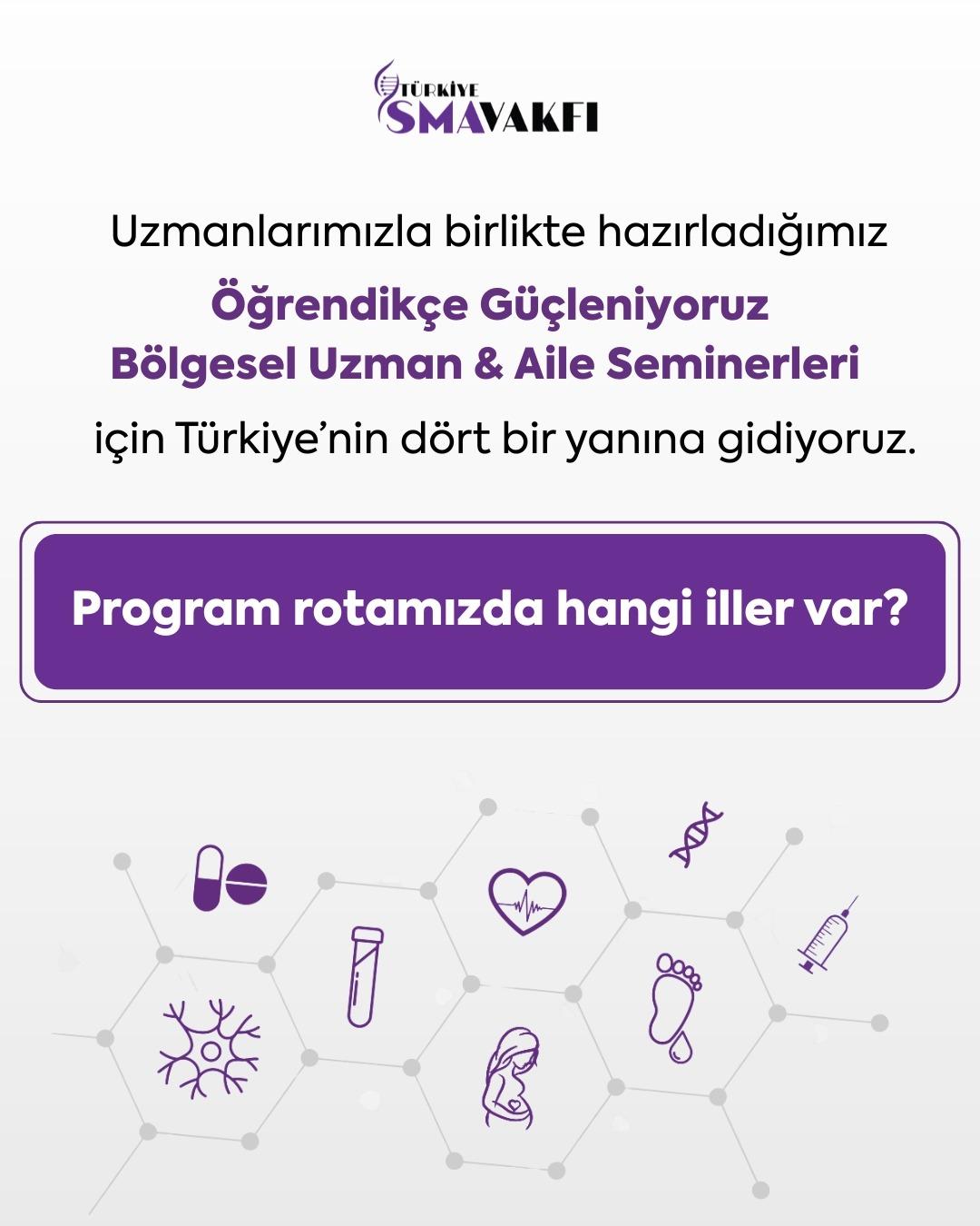 Hasta ve hasta yakınlarının doğru ve bilimsel kaynaklardan bilgiye ulaşmasını sağlamak amacıyla Öğrendikçe Güçleniyoruz Uzman & Aile Seminerleri Programımızı başlatıyoruz. Alanında uzman profesyonellerin yer aldığı bu programı ücretsiz olarak Türkiye'nin farklı illerinde hayata geçirmeyi hedefliyoruz. Çevre illerden de tüm SMA hastalarını ve yakınlarını seminerlerimize katılmaya davet ediyoruz.