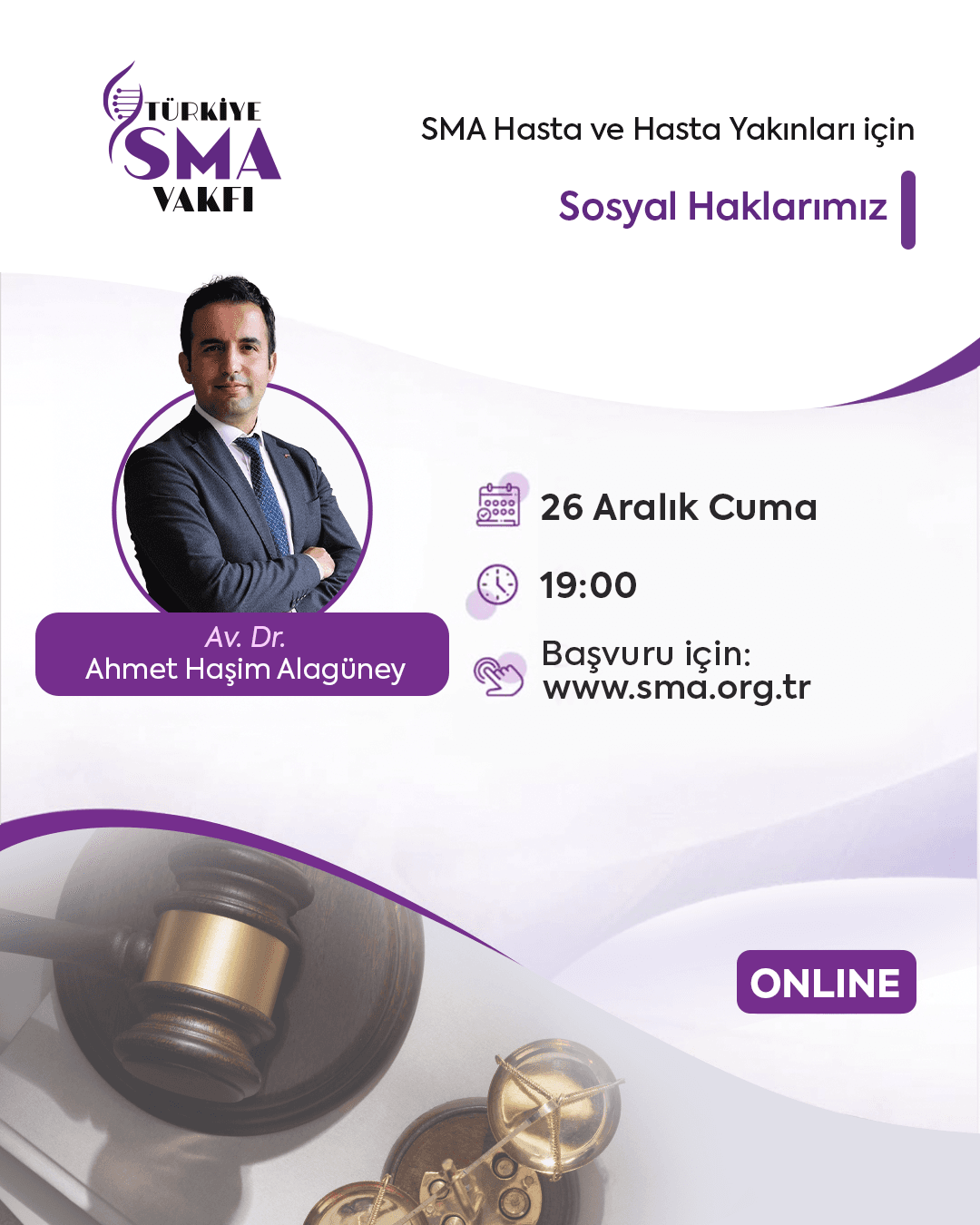 SMA hasta ve hasta yakınlarına yönelik olarak, Av. Dr. Ahmet Haşim Alagüney tarafından “Sosyal Haklarımız” konulu eğitim gerçekleştirilecektir.