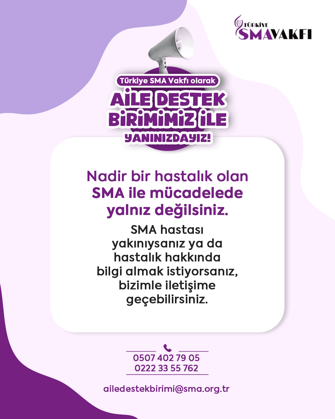 SMA ile yaşayan bireylerin yaşam kalitesini artırmayı ve ihtiyaç duydukları desteklere erişimlerini kolaylaştırmayı hedefliyoruz. Destek almak istediğiniz her konuda; web sitemiz, tüm sosyal medya platformlarımız ve Aile Destek Birimimize ait telefon hattı üzerinden bizimle iletişime geçebilirsiniz.