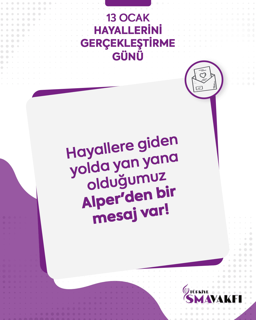 Bugün 13 Ocak Dünya Hayalleri Gerçekleştirme Günü!Hayalleri gerçek olan Alper'in sizlerle paylaşmak istedikleri var.Biz de bu yolculukta SMA hastalarının yanında olmanın ve bu anlamlı dayanışmanın bir parçası olmanın mutluluğunu yaşıyoruz.