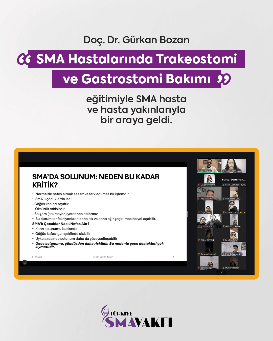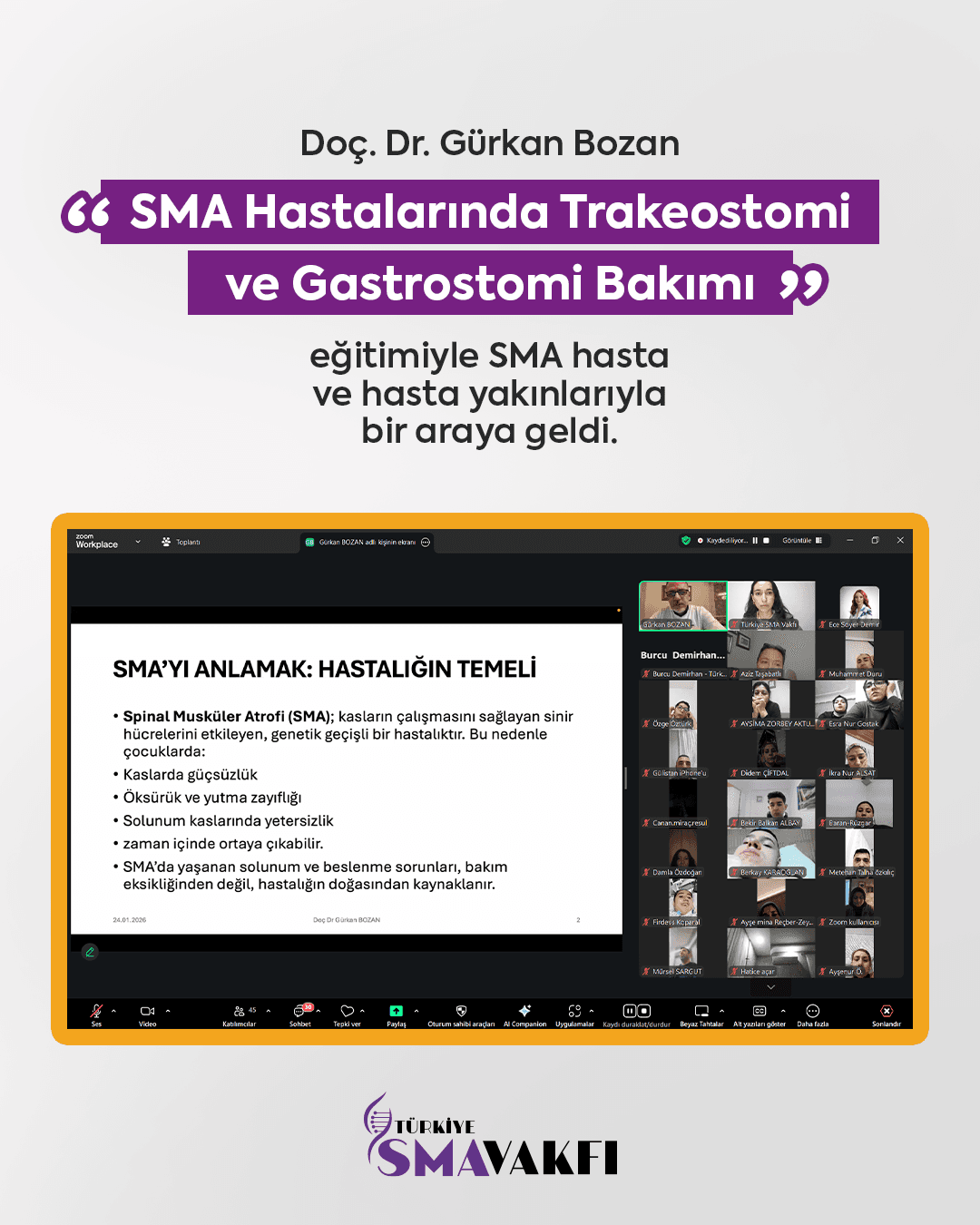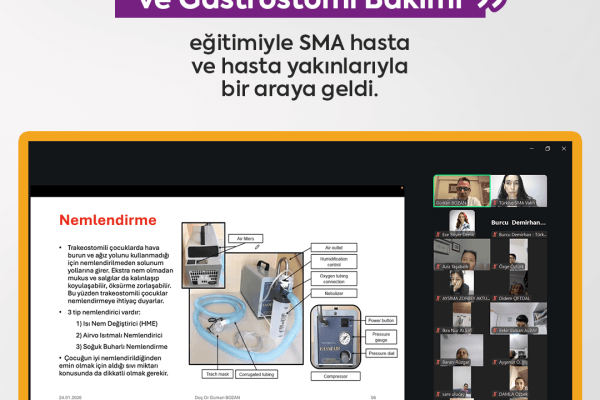 Eğitimimizde; SMA hastalığında trakeostomi ve gastrostomi üzerine önemli bilgiler paylaşılırken, katılımcı ailelerin soruları ve katkılarıyla interaktif bir eğitim gerçekleştirdik.