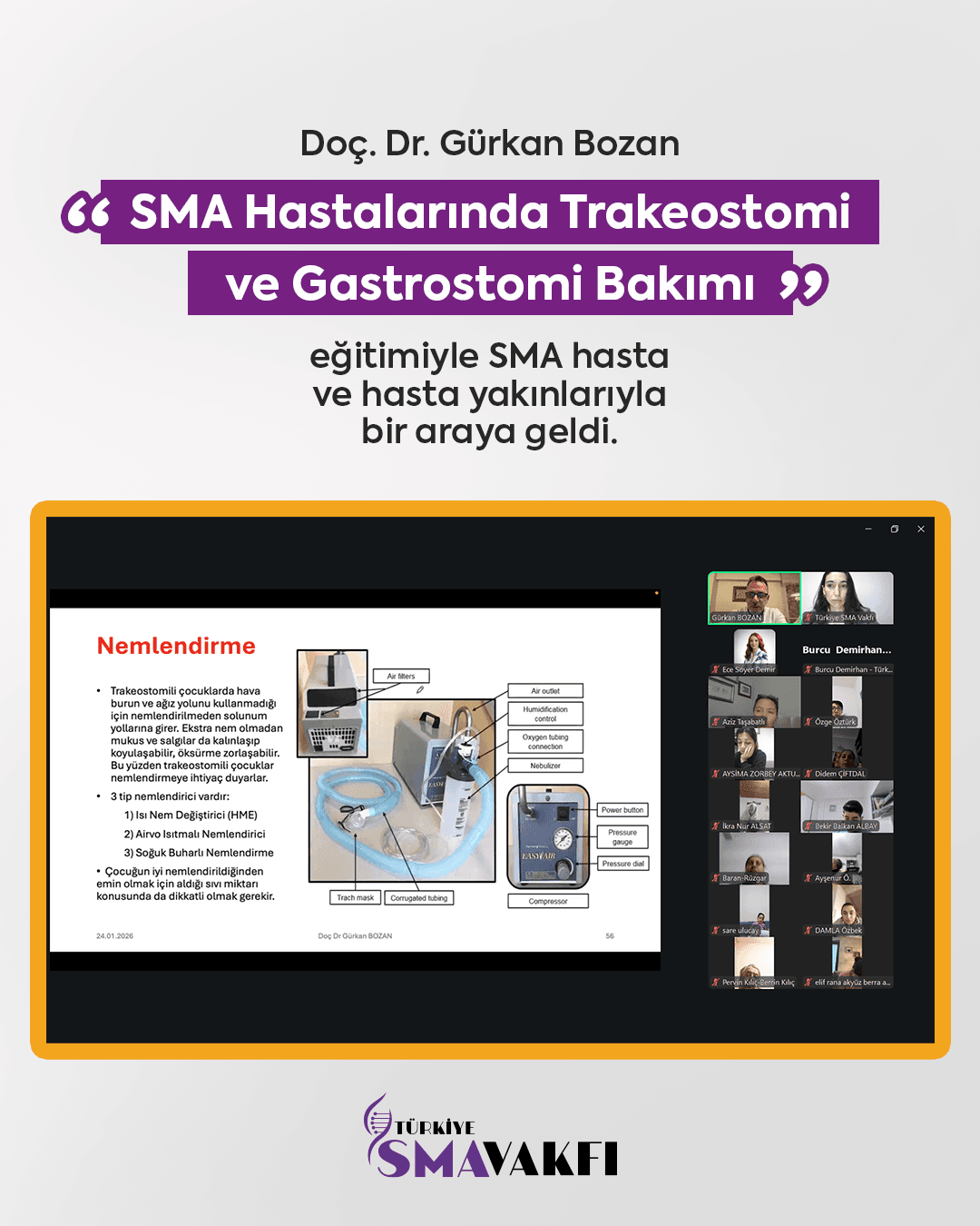 Türkiye SMA Vakfı olarak; "SMA Hastalarında Trakeostomi ve Gastrostomi Bakımı" başlıklı eğitimimizi gerçekleştirdik.