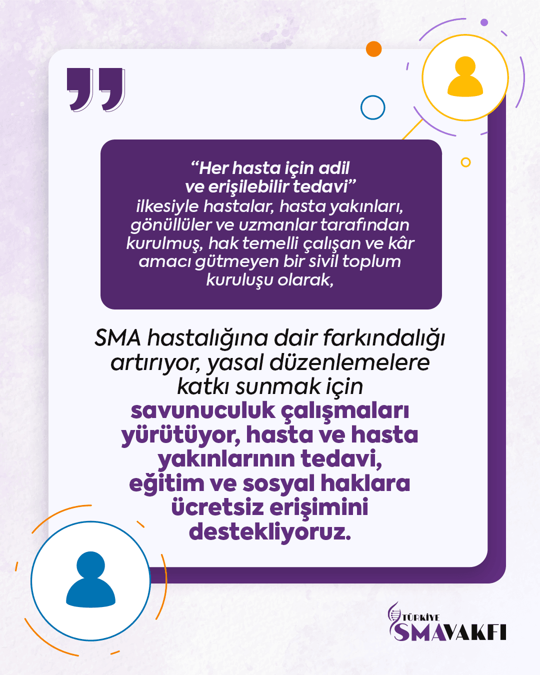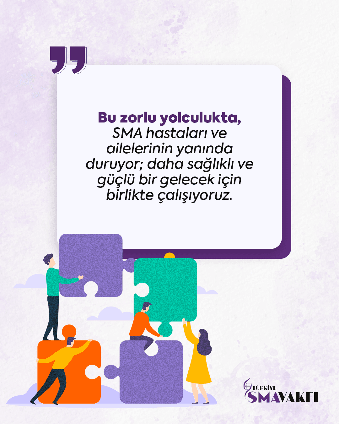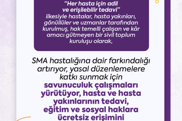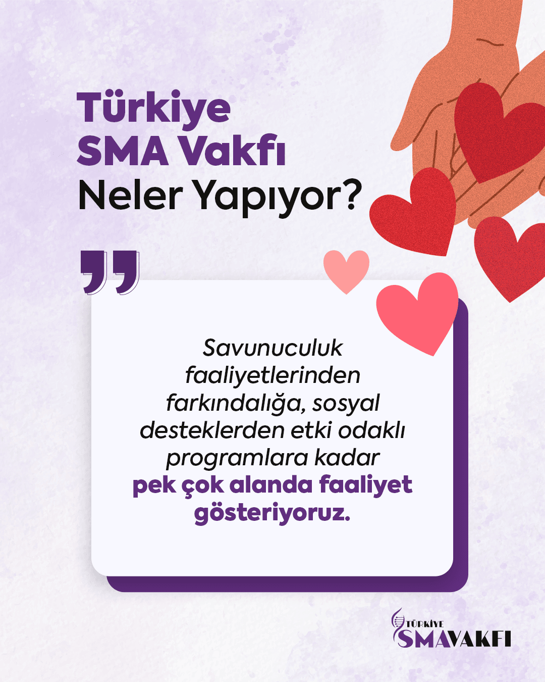 Bugün; farkındalık çalışmaları, eğitim programları, savunu faaliyetleri ve aile destek projelerimizle SMA hastası bireylerin iyilik hâlini güçlendirmek için var gücümüzle çalışıyoruz.